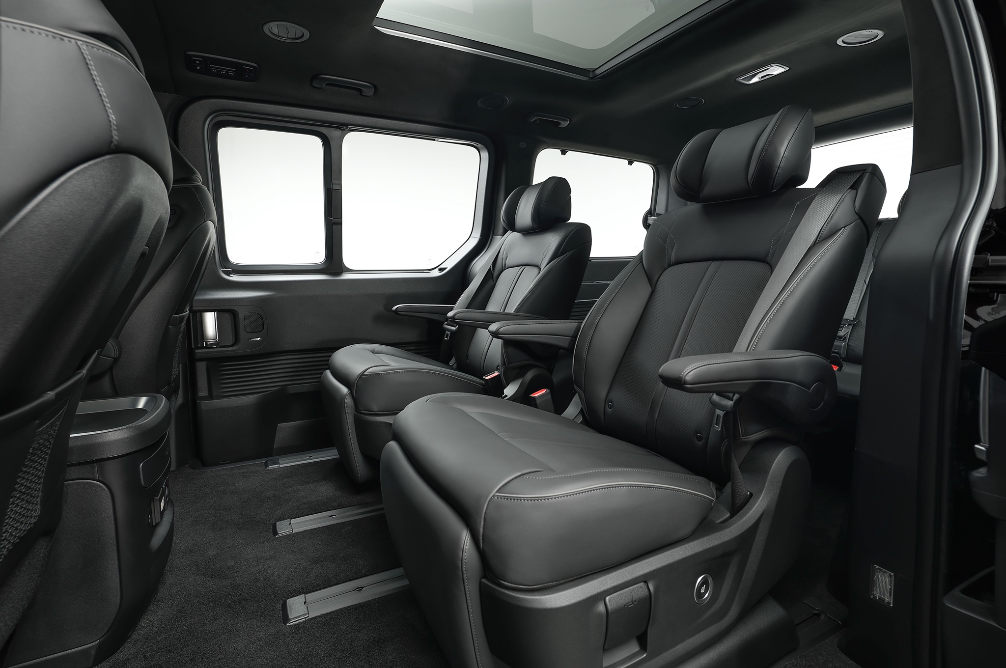 The posher seven-seat version gets electrically powered sliding side doors and tailgate as standard, while they’re optional on the nine-seater car. Hyundai says that the battery packaging has enabled it to boost legroom and headroom. The window line sits quite low too, letting plenty of light into the cabin.