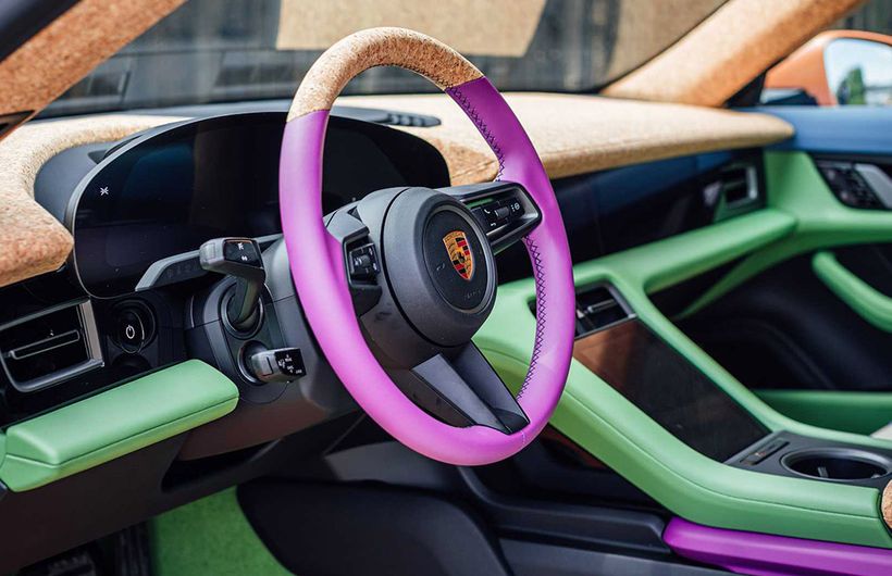 Taycan art car interior comes with corduroy fabric and cork trim The cabin also features cork on the dashboard, A-pillars and the top of the steering wheel. Sections of the centre console and floor mats are also finished in cork. Incorporating the cork trim proved something of a headache for Porsche: the wood comes in rolls, and has to be hand cut to the exact shape to take into account the dashboard’s complex curves.