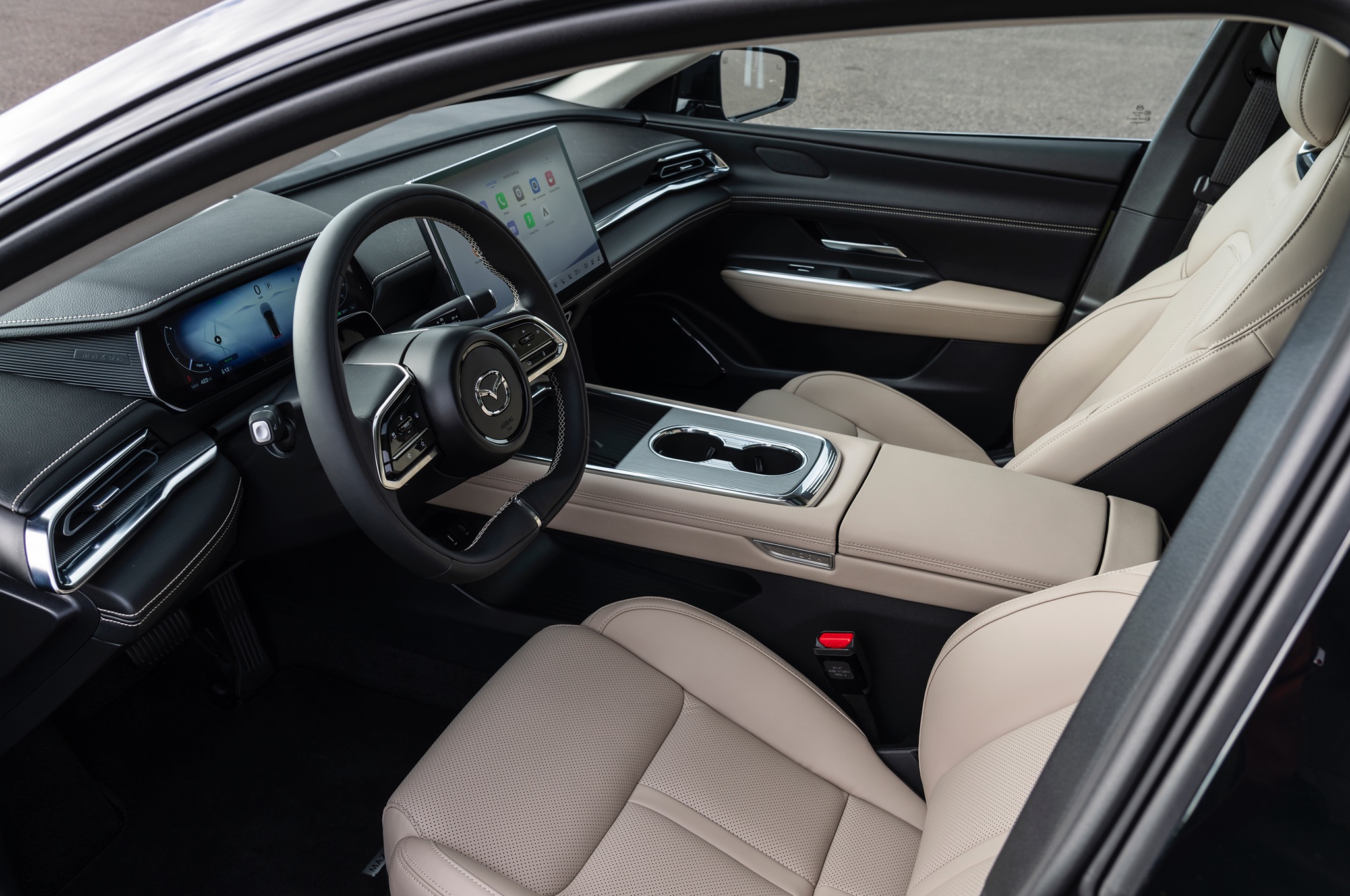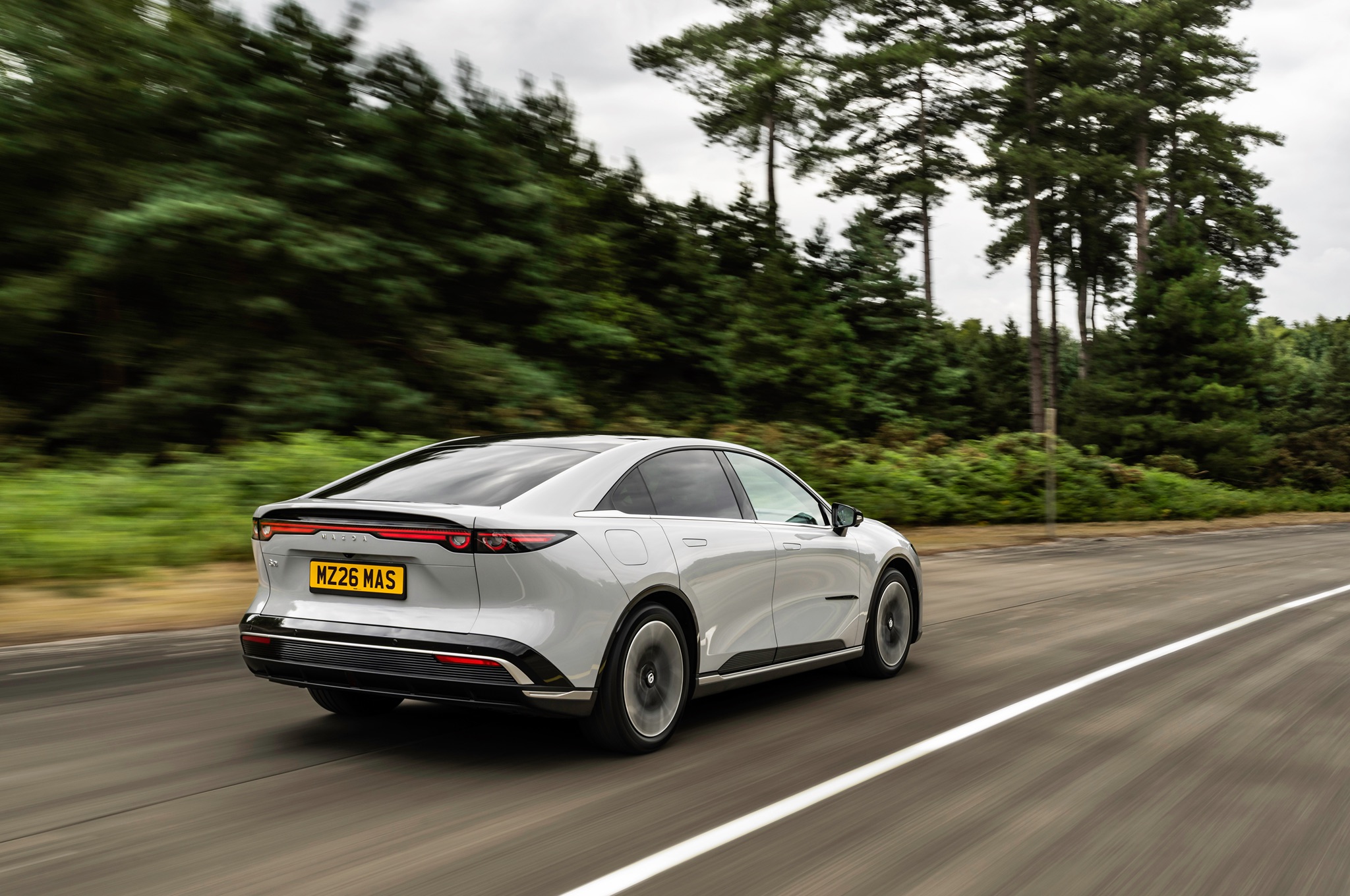 Mazda says that the battery in the UK specification cars “combines the best of both” – the 6e has a WLTP range of 348 miles, and the battery will get from 10–80% at 195kW in 24 minutes.