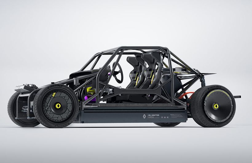 Although the original Renault 5 turbo models were roadgoing versions of the brand’s factory rally cars, the R5 TURBO 3E has been created as a drift car. However, while its predecessors featured a 1.4-litre turbocharged petrol engine shoehorned in behind the rear seats, the TURBO 3E features a steel skeleton frame made from high-strength steel tubing. Behind the passenger cell (which has been built to FIA competition standards) are two electric motors that deliver a total of 380bhp and 700Nm of torque to the rear wheels. The TURBO 3E’s 42kWh battery pack sits below the car (as it will in the final production version of the road car) to deliver a low centre of gravity.