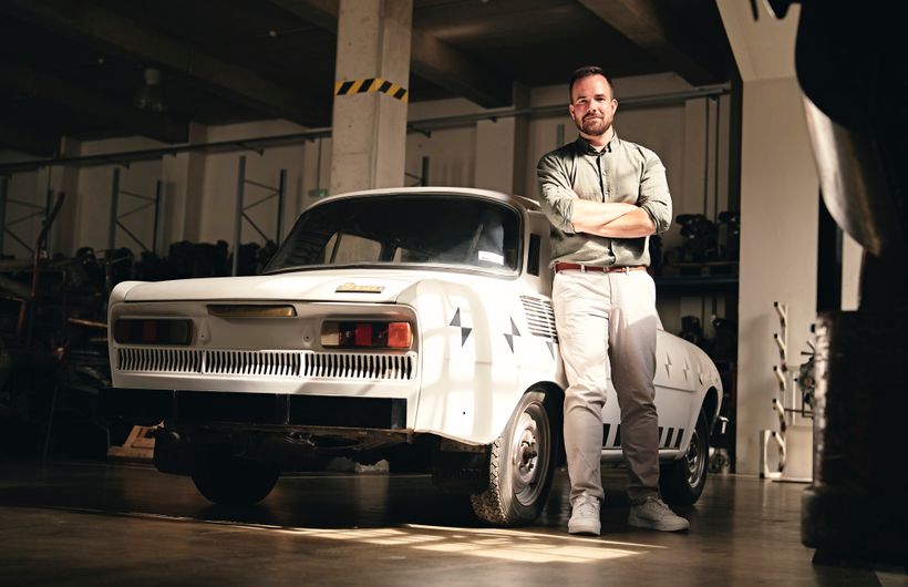 Skoda designer Martin Paclt stands next to Skoda's first million selling car, the 100