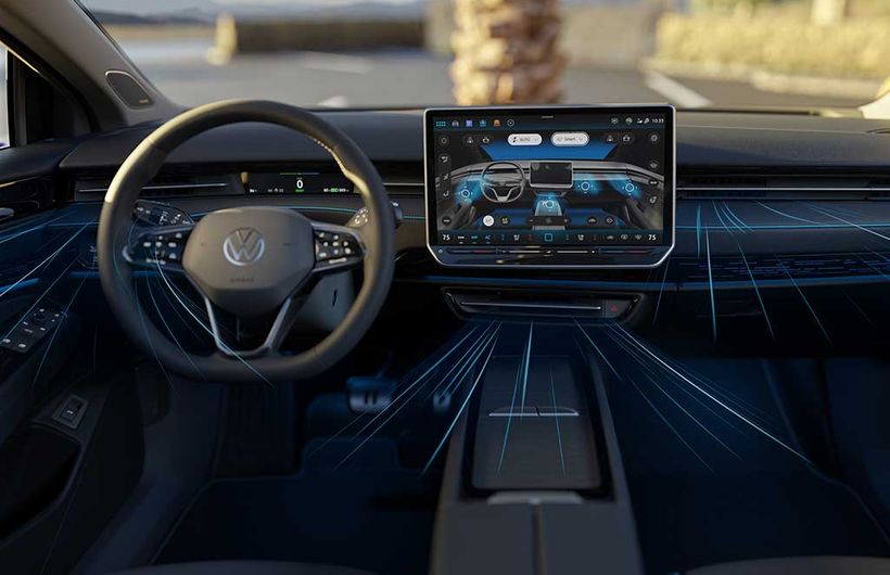 While that’s almost certainly not something you’ll see on the final production car at the end of 2023, a new infotainment system is; VW has revealed the ID.7’s dashboard, including a new 15-inch touchscreen display and climate control switchgear.