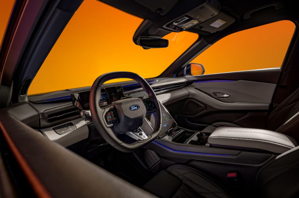 Inside the Capri, it’s all rather familiar from the Explorer – but the seats are a bit Capri-like. with integrated head rests like the original car, and the steering wheel is also Capri inspired with its single spoke at 6 o’clock.
