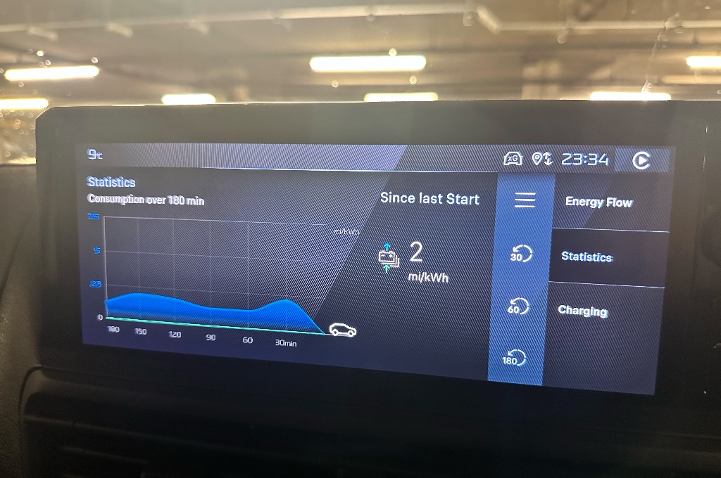 Across mixed driving environments — city traffic, A-roads, and motorway work — efficiency settled at around 2.1 miles per kWh, which quickly resets expectations.