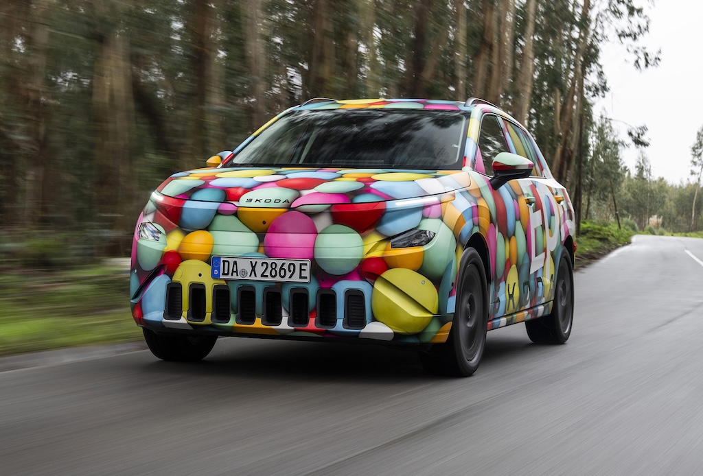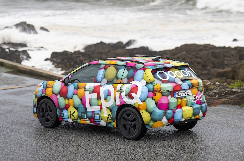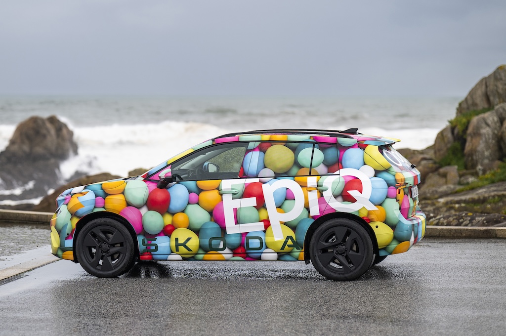 I’ll stop there, other than to say that the Epiq is chunky but compact, and you can see distinctive elements on the disguised car that I drove - like the butch-looking lower grille design - that hints at the SUV styling. That’s a very deliberate thing, as the Epiq is intended to be an electric equivalent of the popular Skoda Kamiq, rather than a conventional hatchback like the Fabia. Do you like the camo that Skoda has used? It looks like a kids ball pit, to me, which is fun. I love a ball pit.