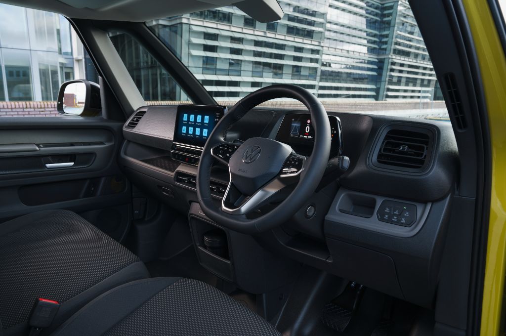 The cab is separated from the load cube by a solid bulkhead that can be optionally specified with a shallow window. The dashboard layout differs slightly from that offered on the MPV version of the Buzz with a simpler layout and black materials in place the passenger version's bright colours. Customers can choose between a three-seater layout (two-seater bench and driver's seat) or two individual seats as a no-cost option. The dashboard stretches out in front of the cab and despite covering a huge area, is cleverly detailed and neatly laid-out. The cockpit in front of the driver is formed by a free-standing 5.3 inch ID.Cockpit display. Positioned centrally in the middle of the dashboard is the ‘Discover Pro’ infotainment system which has a standard 10-inch touchscreen. The optional Infotainment Package Plus offers a larger 12-inch screen.