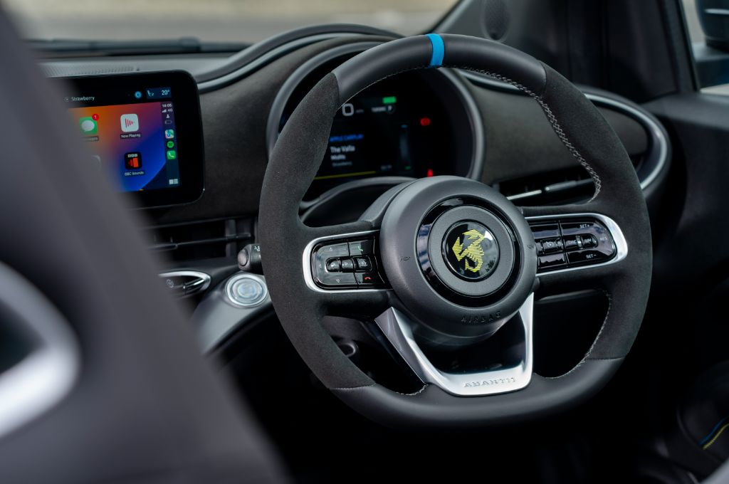 Other Abarth-specific elements include (on the pricier Turismo version) a lovely three-spoke steering wheel that comes complete with Alcantara trim and a rally-style coloured trim strip at the very top of the wheel. The dashboard also features Alcantara trim across its full width to reinforce its sporting chops.