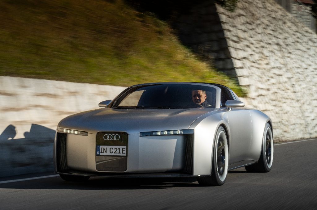 The Audi Concept C is an all-electric roadster. Or… a coupe, because it has a folding hard top. This in itself is a bit of a blast from the past as most other rivals have abandoned these and moved back to soft tops. Even the Mercedes SL has a fabric roof, these days.