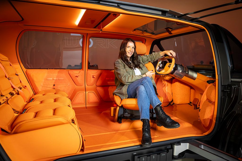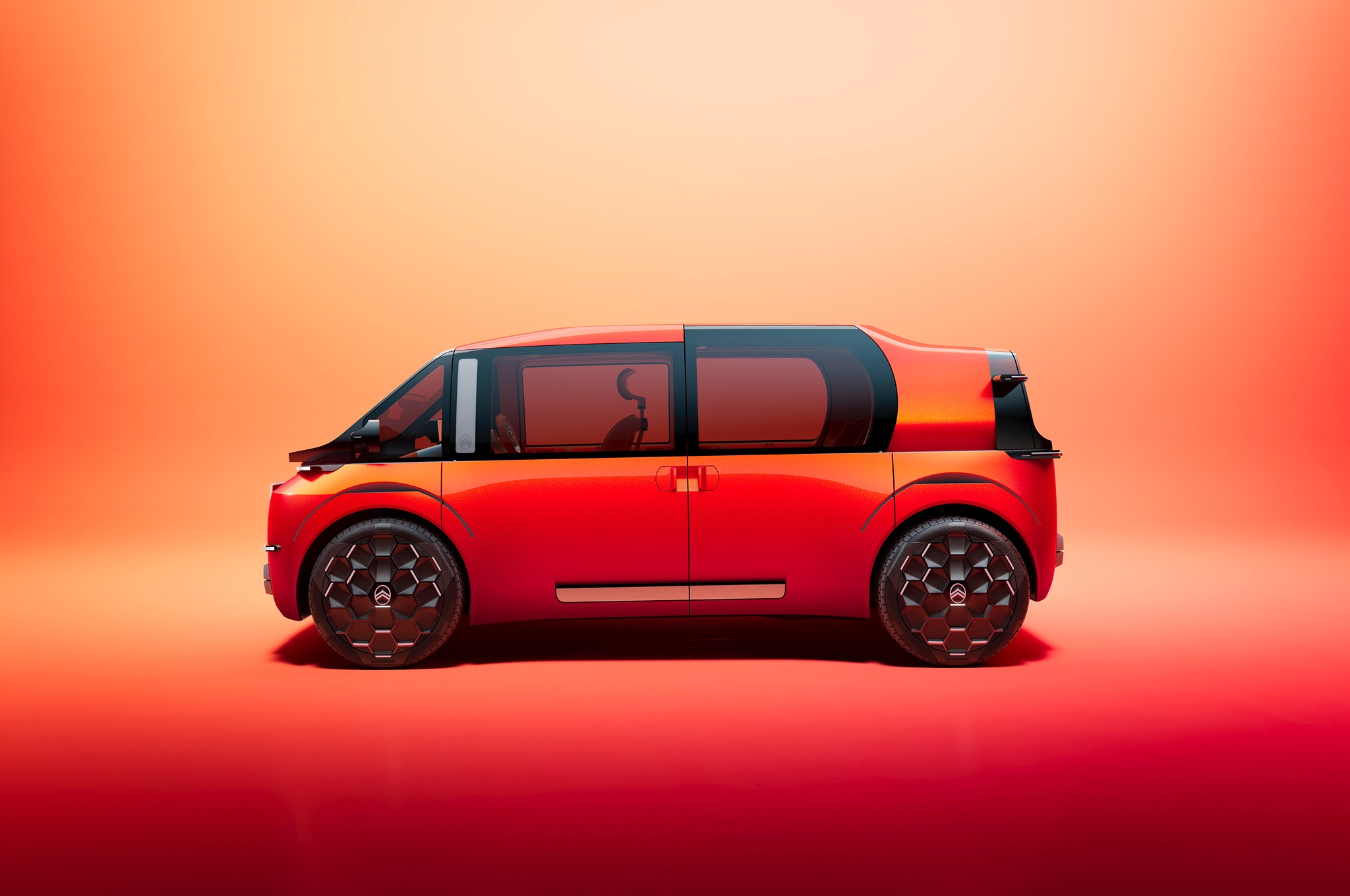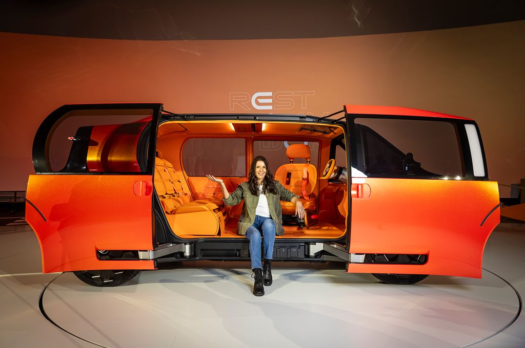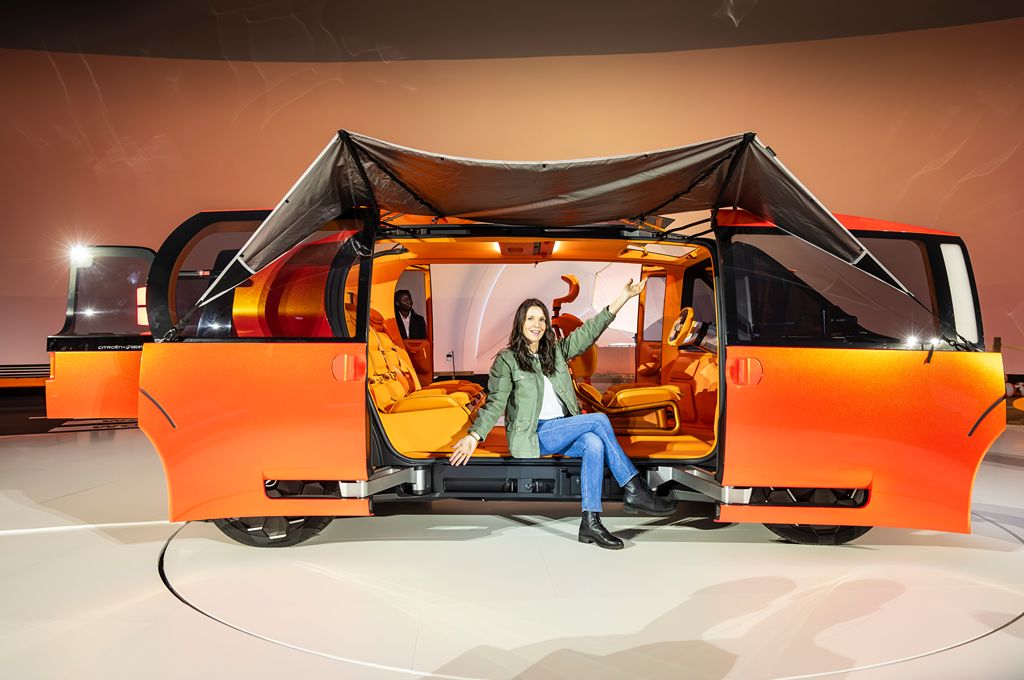 I think there’s a real happy energy to the whole concept car, really. That warm orange paint flips tones in the light - orange one second, red or yellow the next. Big glass windows? Oh yes. Citroen’s basically built a light-filled conservatory on wheels, including rear doors that climb into the roofline to keep the cabin bright. At the back you’ve got a split tailgate - very utility-vehicle (dare I say like a mini Range Rover?!) plus a roof section that props open so you can load taller stuff… or lie back and stare at the stars when you’re in sleep mode. More about that when we look inside.