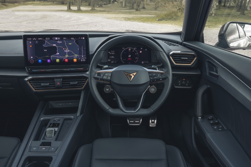The Cupra’s 12-inch touchscreen infotainment system is an impressive standard feature of every model. It gets nav, digital radio, Bluetooth, Apple CarPlay, Android Auto, USB-C inputs and wireless phone charging across the range. The system is high-set on the dash, has sharp graphics and looks seriously smart, so it’s unlikely that the slightly confusing menu layout will put anybody off, but it does take time to get used to the menu layouts and where some of the sub-menus are. More than that, it’s easy to accidentally hit the touch-sensitive climate control buttons (that run beneath the screen) while you’re trying to use the system. We’d also like a physical volume control switch, although the steering wheel button controls are an easy way for the driver to adjust volume and plenty of other features.