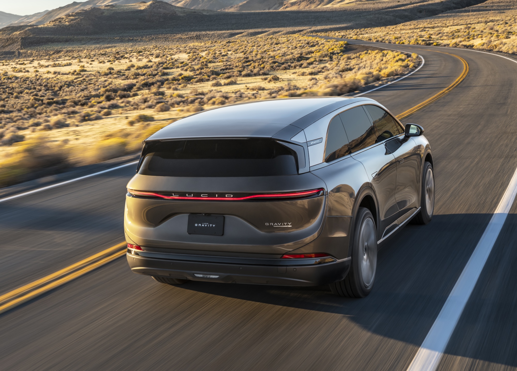 This performance is from exceptionally power-dense motors (already a highlight in the Air) and a suspension system called “Zero Gravity”. It adapts automatically to road conditions and can raise for off-road clearance or lower for efficiency and handling. Lucid says the real party-trick with this system is that it allows the Gravity to cruise softly, corner neatly, and still sprint like a true performance when needed.