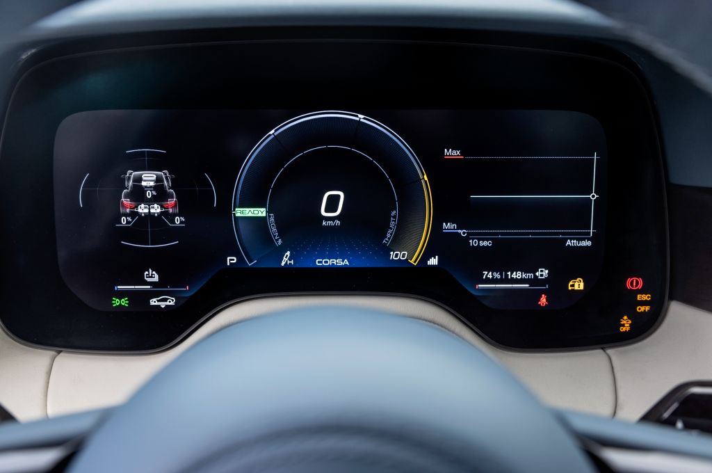 The heavy display count may go against more traditional sports car interior design, but the Maserati proves a wonderful exercise in material selection and finish. This starts with the loving perforations in the seat covers woven from recycled nylon, and ends with the copper threads, which run finely chiselled through the consoles as a nod to the car’s electric drivetrain.