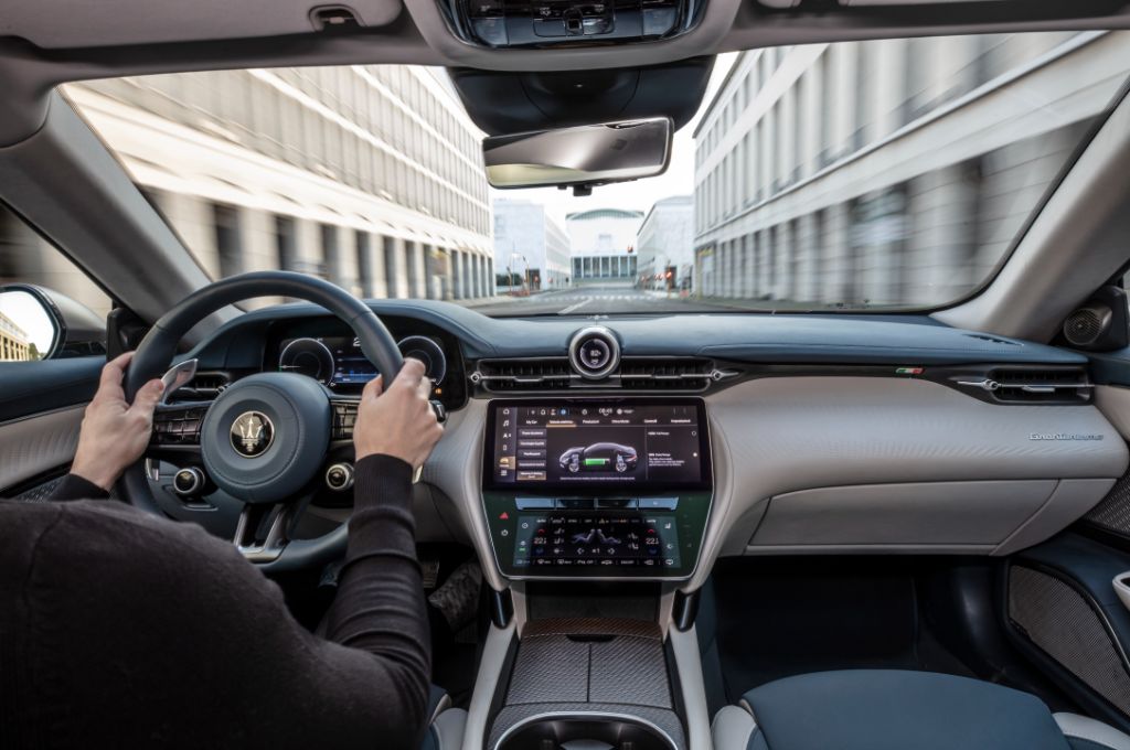 The final element is the digital clock mounted at the top of the dashboard. Maserati introduced this in the Grecale SUV, and it doubles as an interface for the voice assistant function. It’s also a notifications hub for any connected smartphones, and the car’s charging functions.