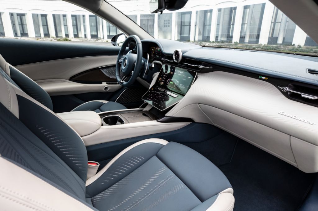 And GranTurismo is not only fast when driving, but also when charging. The car boasts cutting-edge 800-volt technology - the peak standard among European manufacturers - which enables a maximum charging rate of 270kW. In ideal circumstances, and with a powerful enough charging station, you can add up to 62 miles of range in under five minutes. The GranTurismo also automatically pre-condition the battery for best possible charging speeds, provided you put the charging stop into the nav, and it gets a heat pump for better winter efficiency. There's no vehicle-to-load or vehicle-to-grid, though.
