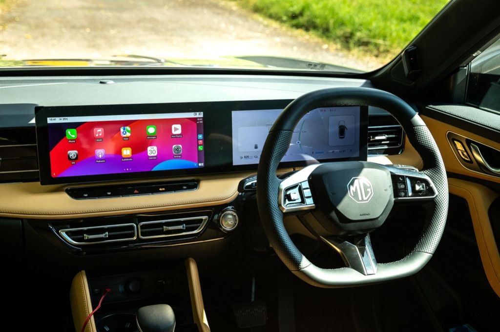 The cabin is a vast improvement over the original HS and appears smart and neat, with the same squared-off steering wheel as the MG4 and a smartly integrated and intuitive touchscreen and native software, while the control system – known as MG Pilot – is fully compatible with both Android Auto and Apple CarPlay, albeit with a notable glitch. We’re not at all keen on the air conditioning controls, which can only be operated from sliders on the screen and not via rotary dials. Switching between Android Auto/Apple CarPlay and the native sat nav/infotainment system is unnecessarily fiddly, but is also necessary, as you can’t operate the climate settings otherwise if running your own media.
