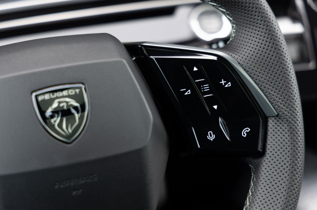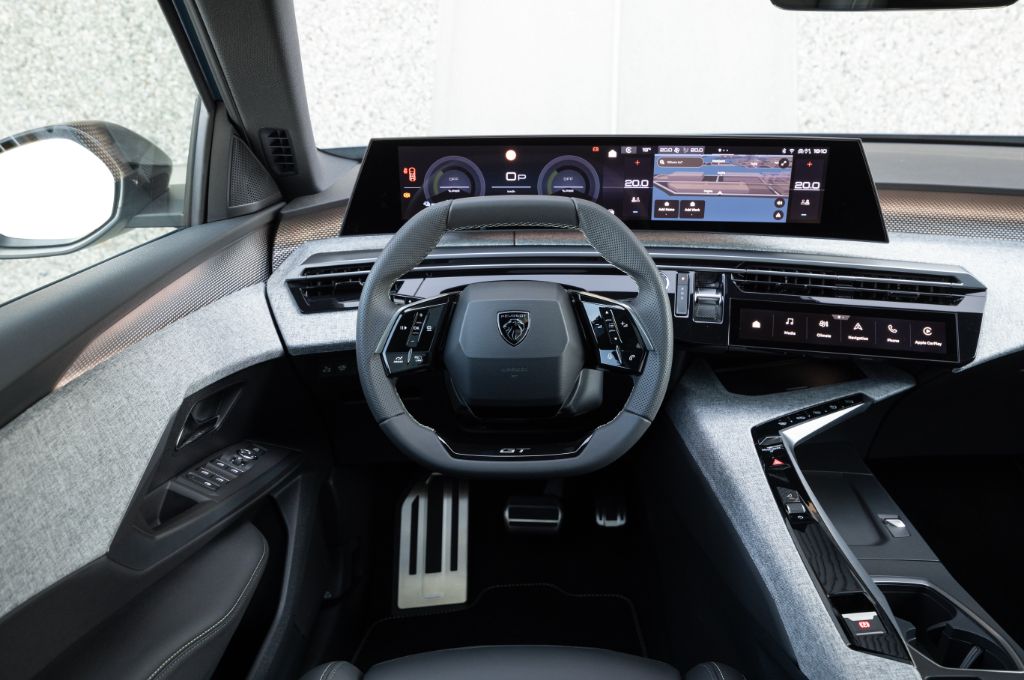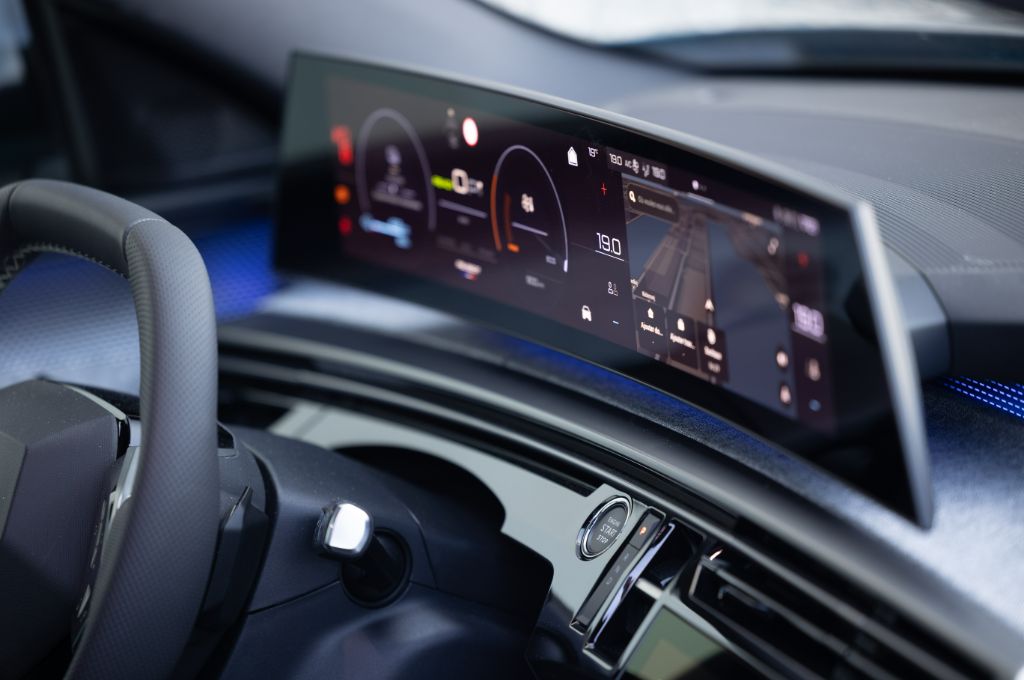 A ‘floating’ 21-inch, curved display is a real standout feature, and houses the central touchscreen infotainment system as well as the digital display behind the small steering wheel. I find it way easier to get a comfortable driving position with this new dash layout, than with the annoying layout of the previous 5008, and I don’t even mind the tiny steering wheel. Even taller drivers can see the speedo properly, too, although while we’re talking about the driving position it’s a shame that lumbar adjustment happens via a clunky, rotary controller. In a car that’s been tweaked and buffed to feel impressively premium, the fact that electric seat adjustment is optional even on top-spec GT seems irritating.