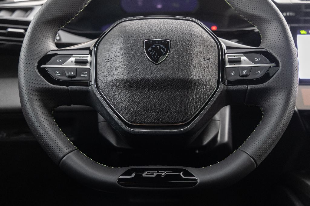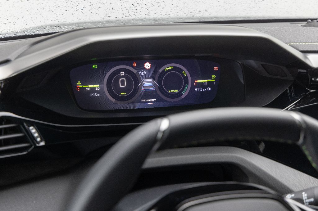 Inside the E-308 you’re immediately confronted by the 10-inch ‘i-Cockpit’ touchscreen, and a digital readout set high above the small steering wheel so that it’s in the driver’s eyeline. This setup annoys some people as they don’t know whether to look through or over, and the small steering wheel can make steering response feel a quite quick and darty,