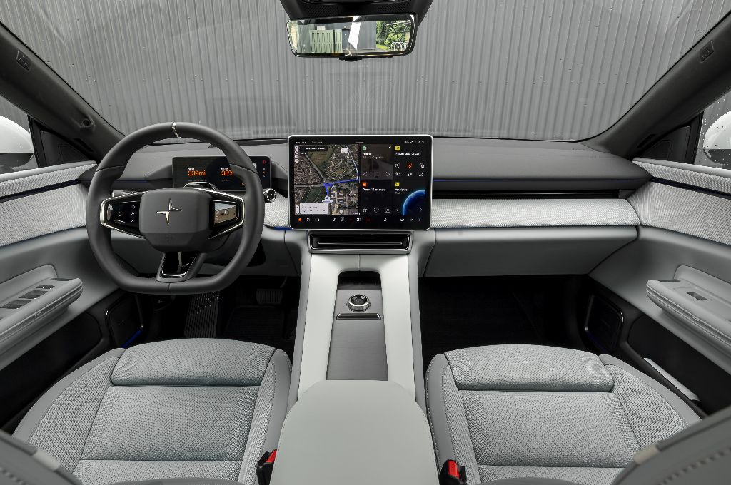 It’s all very Scandi-cool in the Polestar 4, which is characterised by the vegan, sustainable materials that the brand has championed since it was launched. The company claims that the 4 is actually the most sustainable car it makes; it uses a very limited number of materials inside to make recycling easier, and the materials it does use are mostly made from recycled plastic bottles or fishing nets. The aluminium in the body of the car is also made using hydropower electricity, and the factory where it’s built in China is powered partly by a solar array on the roof.