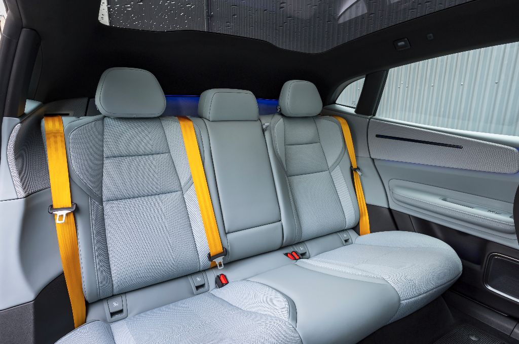 Of course, the most controversial aspect of the Polestar 4 is that rear window, or rather the lack of it. For what it’s worth, there is a standard full-length glass roof which stretches beyond the rear occupants’ heads, and the rear-view mirror is replaced by a high-definition screen that shows a feed from a roof-mounted rear camera. This is claimed to enable a far wider field of view than most modern cars with conventional rear-view mirrors.
