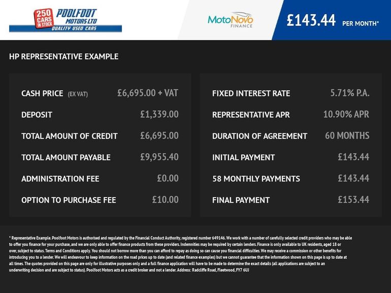 This representative example is for illustration purposes only and does not constitute an offer. Written quotations are available on request and finance is subject to status. Terms and conditions apply. A guarantee may be required.